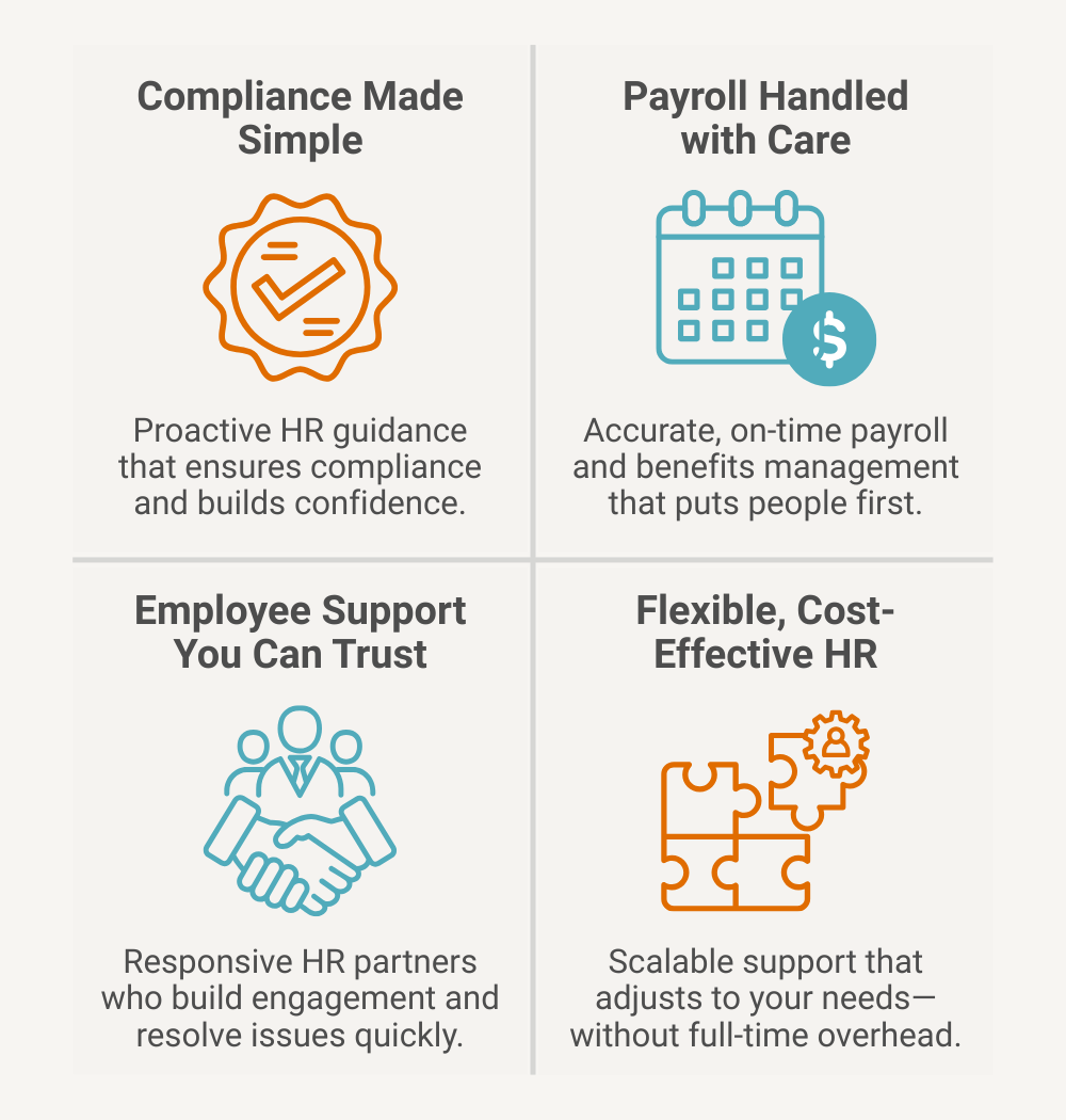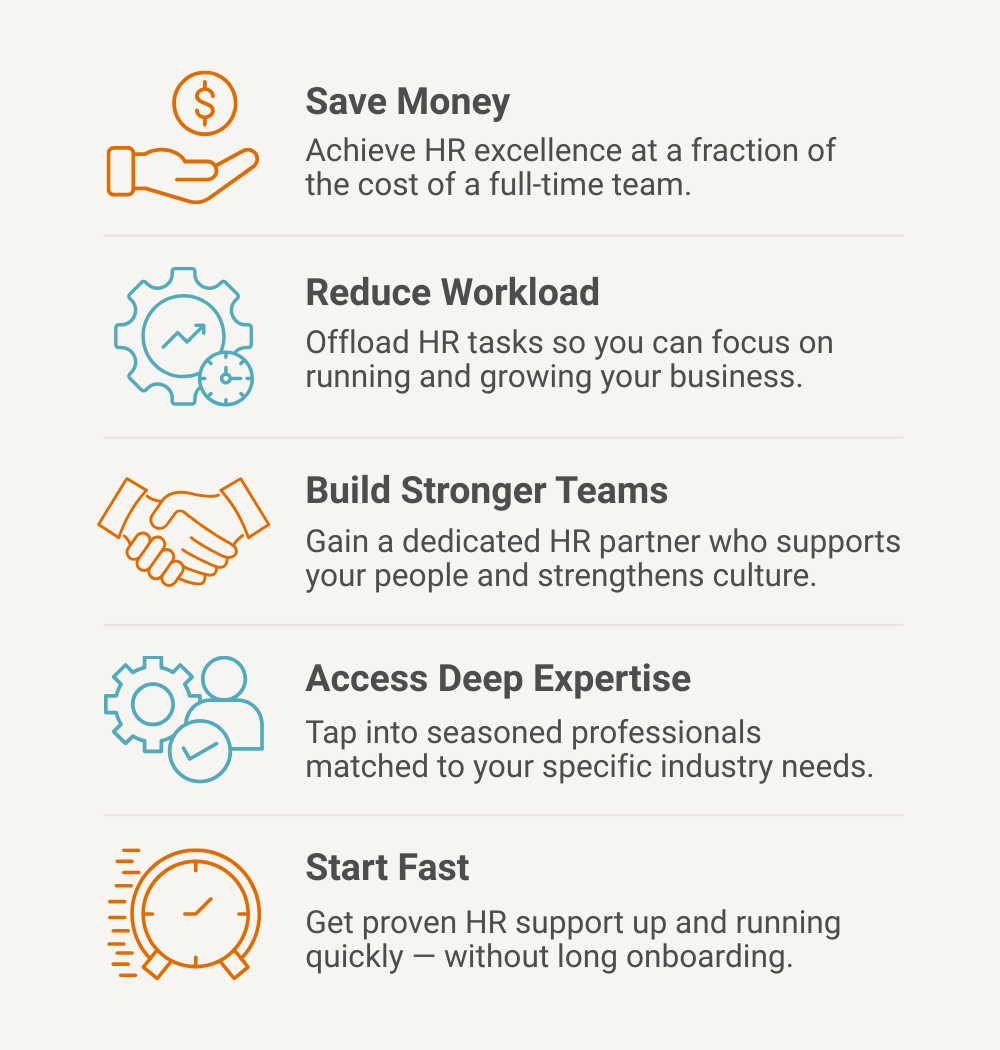Get expert HR and people operations guidance without the cost of a full-time hire. We help with compliance, payroll, employee relations, and recruiting. This reduces overhead and saves many clients thousands each year.